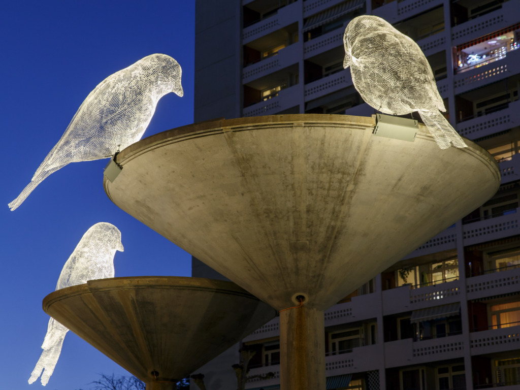 Les Oiseaux de Cédric Le Borgne se désaltèrent dans les fontaines des Tours de carouge (archives). (© KEYSTONE/SALVATORE DI NOLFI)