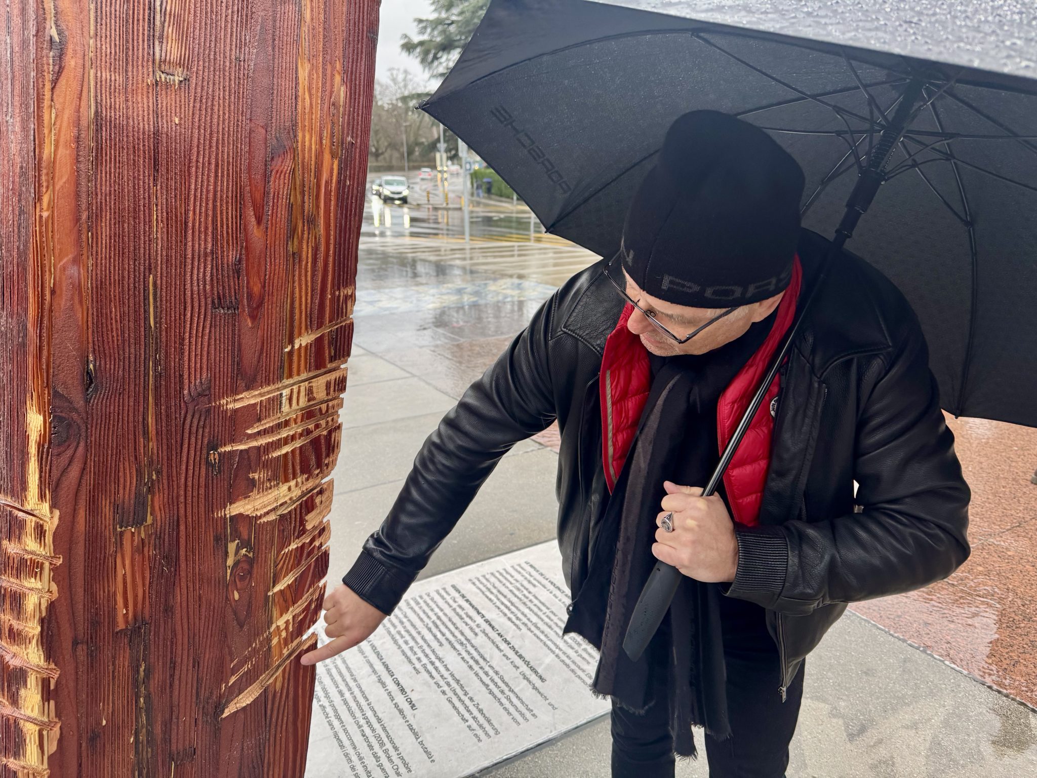Le maitre charpentier Thomas Büchi, au chevet de la Broken Chair vandalisée, ce jeudi matin, sur la place des Nations à Genève.