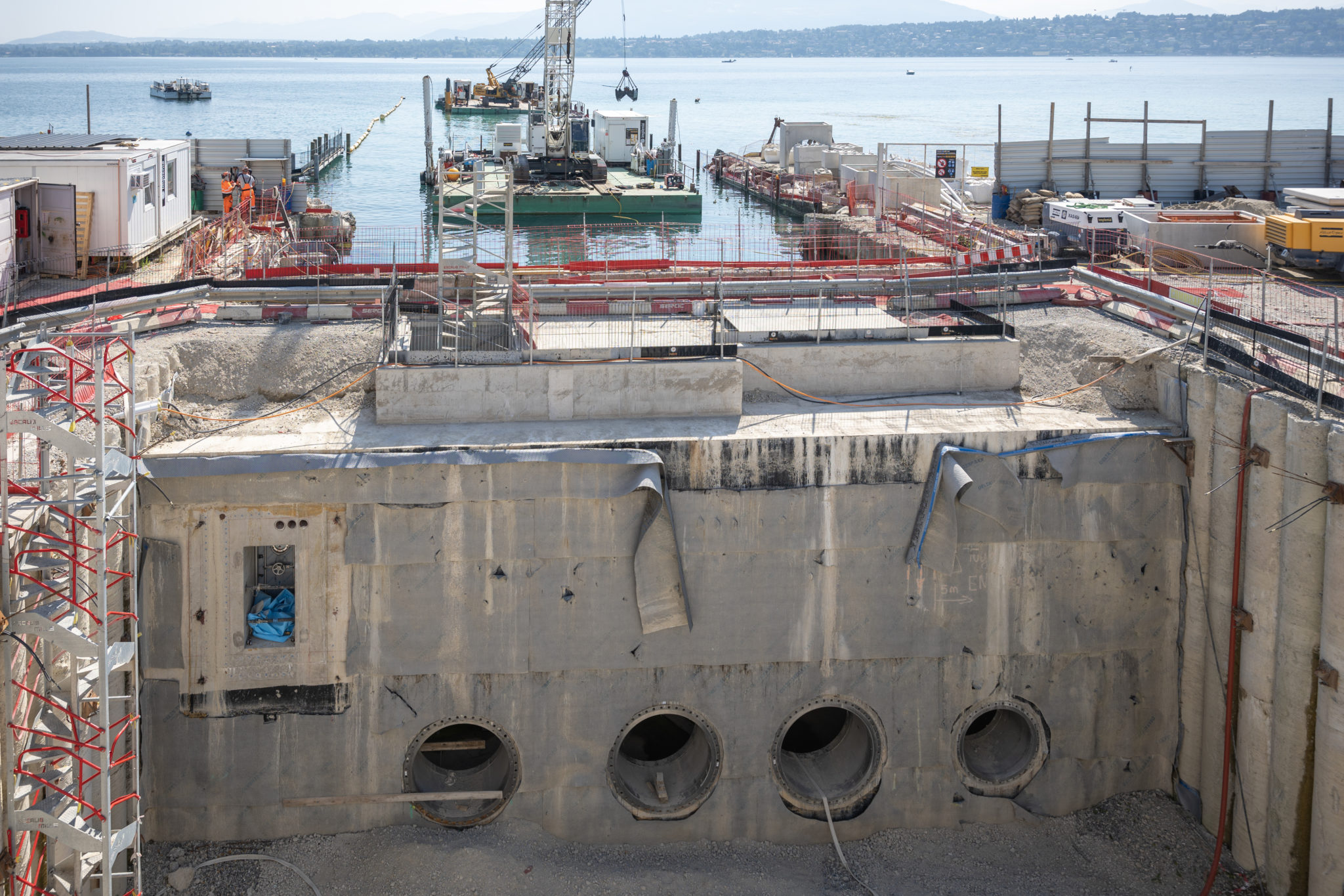 Débutés en 2019, les travaux de gros oeuvre de la station de pompage du Vengeron (STAP) sont terminés. L'ouvrage au coeur du réseau thermique Genilac destiné à refroidir et chauffer 350 bâtiments sera prêt en 2024. Le chantier a notamment pris du retard en raison de l'invasion des moules quagga dans le Léman.