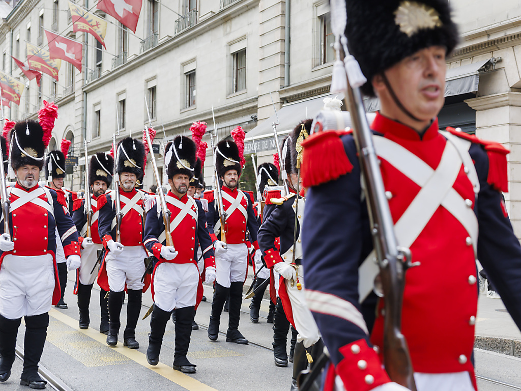 Les troupes des Vieux-Grenadiers défilent dans les rues à l'occasion des 275 ans de la société. (© KEYSTONE/SALVATORE DI NOLFI)