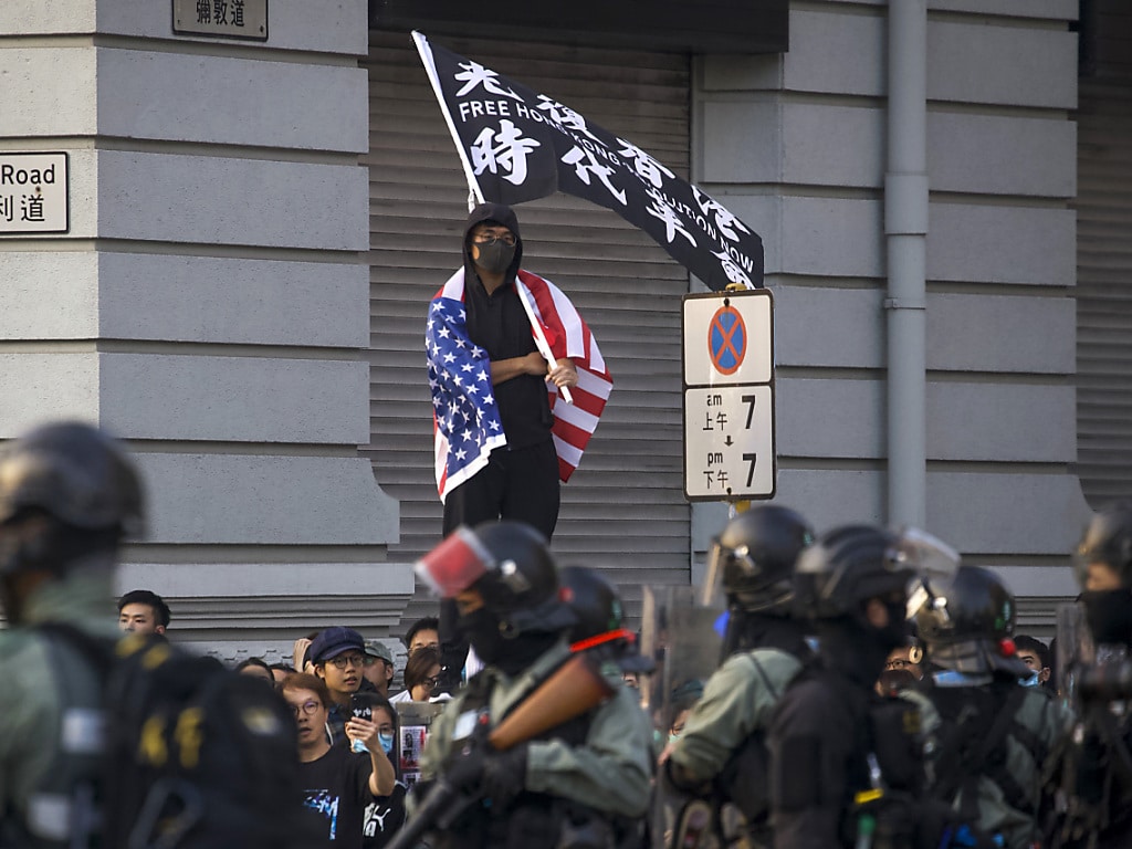 Un manifestant surveille la foule alors que des policiers bloquent une rue de Hong Kong dimanche. (©KEYSTONE/AP/NG HAN GUAN)