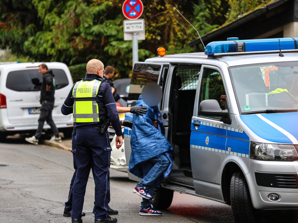 Des policiers conduisent un adolescent vers un fourgon de police. La nouvelle maire élue de Herdecke, Iris Stalzer (SPD), a été retrouvée grièvement blessée dans son appartement. Elle aurait reçu plusieurs coups de couteau, selon les autorités. (© Keystone/DPA/ALEX TALASH)