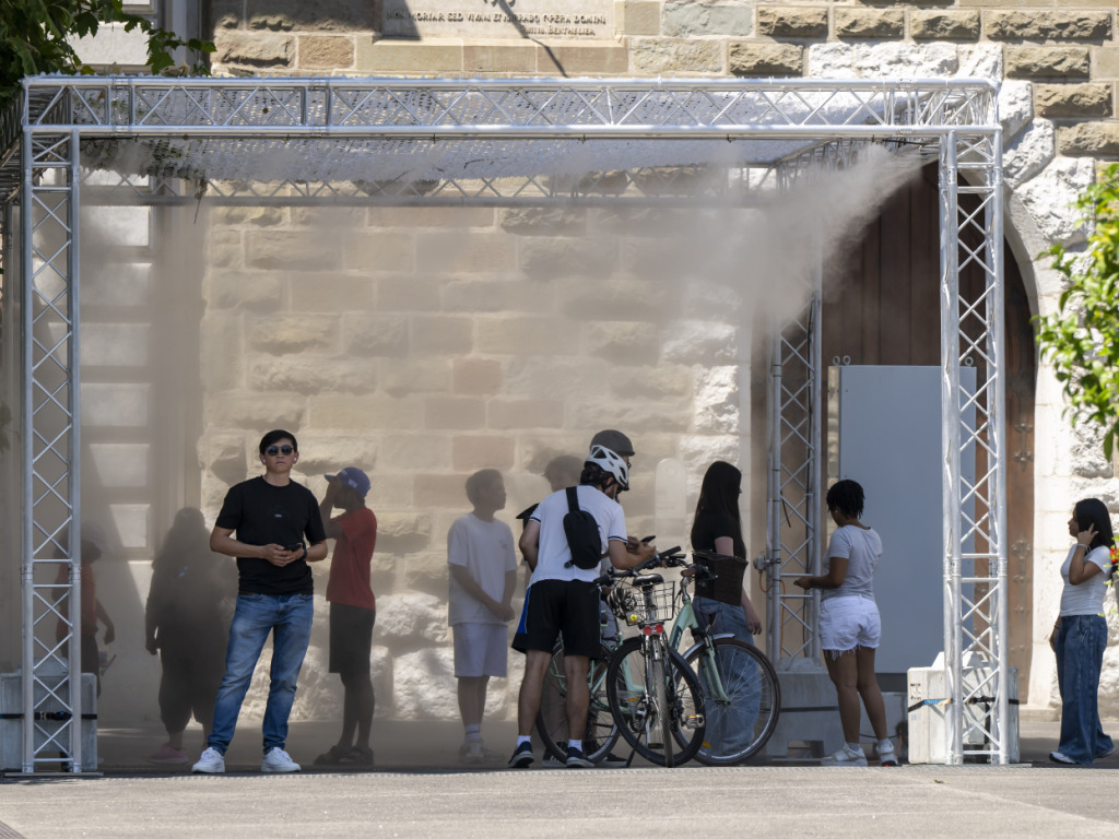 Des personnes profitent d'un brumisateur gàant installe par la ville de Geneve afin de se rafraichir le dimanche 22 juin à Geneve, en pleine canicule. (Image d'illustration) (© KEYSTONE/MARTIAL TREZZINI)