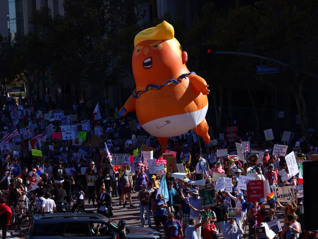 Dans l'une d'elles, il apparaît coiffé d'une couronne et aux commandes d'un avion de chasse qui largue ce qui semble être des excréments sur des manifestants anti-Trump.