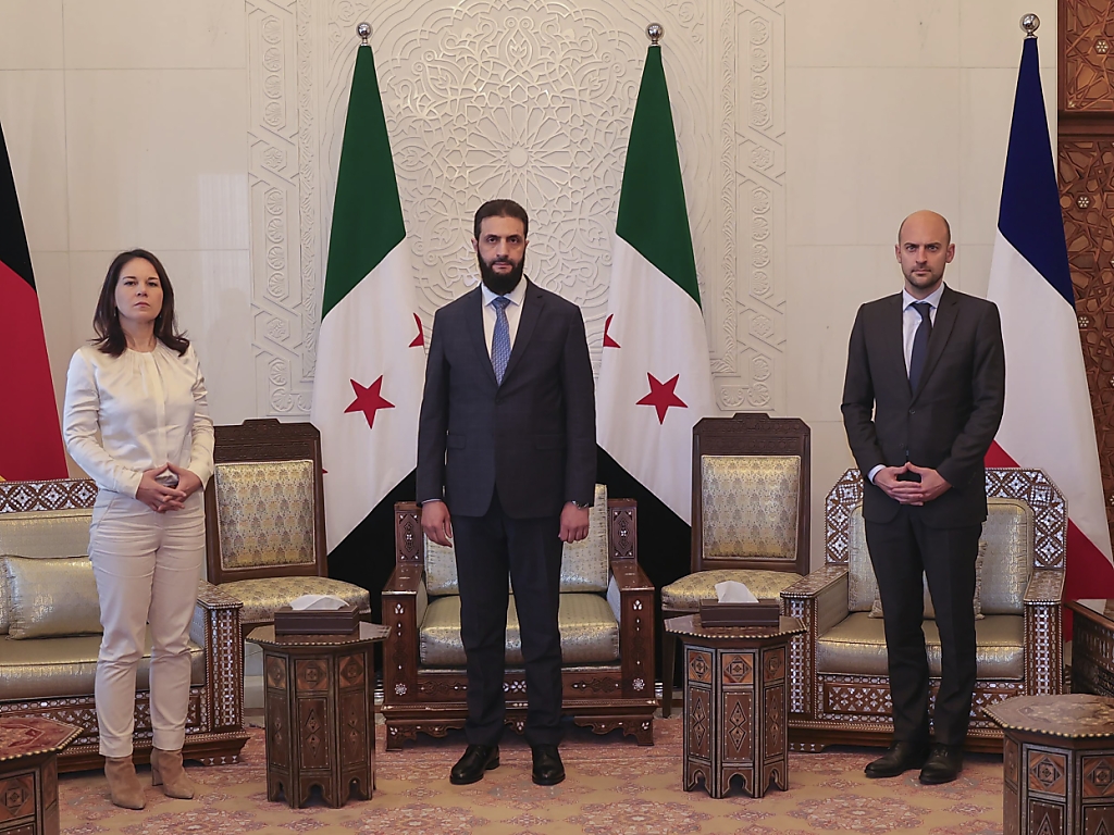 Le leader syrien Ahmad al-Sharaa n'a pas serré la main de la ministre allemande Annalena Baerbock, à gauche, contrairement à celle de son homologue masculin, le Français Jean-Noel Barrot, à droite. vendredi à Damas. (© KEYSTONE/AP)