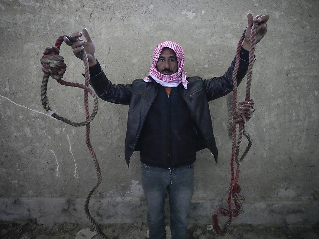 Un homme montre deux cordes en forme de n½ud coulant, trouvées dans la tristement célèbre prison militaire de Saydnaya. Des foules se rassemblent pour entrer dans la prison, connue sous le nom d'« abattoir humain », certains espérant retrouver des parents qui y ont été détenus. (© KEYSTONE/AP/Hussein Malla)