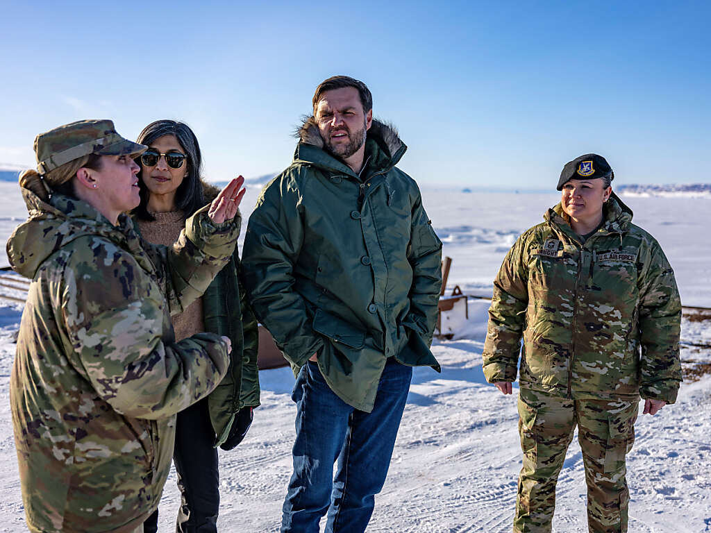 Lors d'une visite sur la base militaire américaine de Pituffik au Groenland, le vice-président américain JD Vance (au centre) a vivement critiqué le Danemark. (© KEYSTONE/AP/Jim Watson)