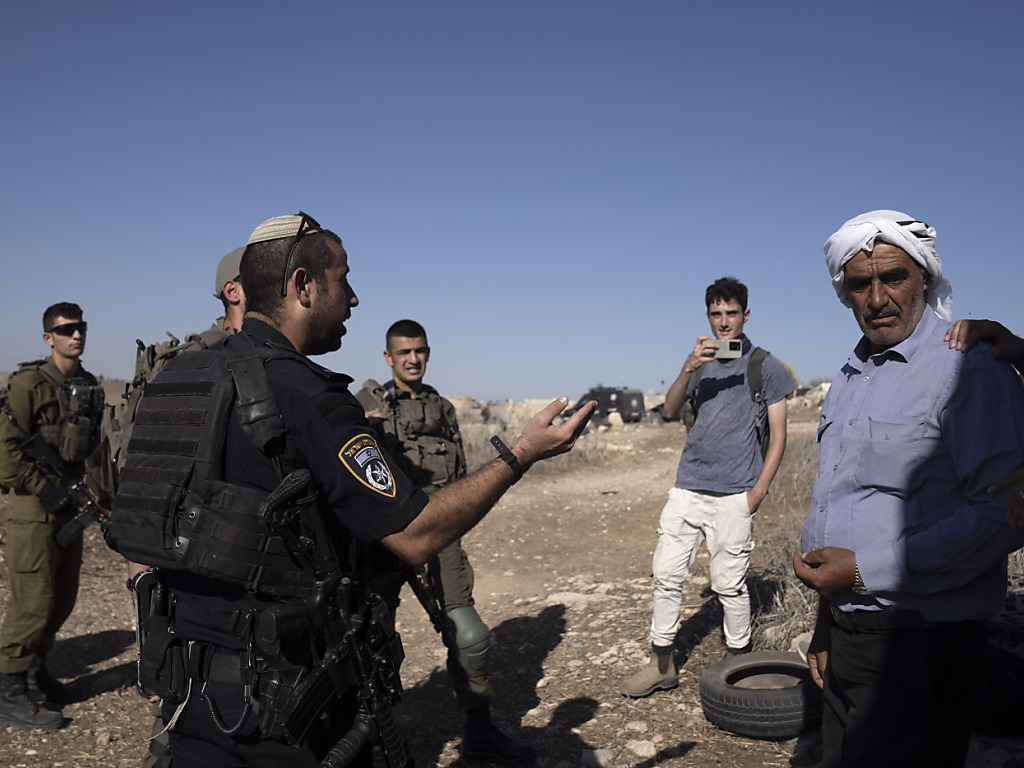 La police israélienne avec des résidents palestiniens de Khirbet Zanuta, en Cisjordanie, menacés de mort par des colons israéliens s'ils ne quittaient pas leur village. (© KEYSTONE/AP/MAYA ALLERUZZO)