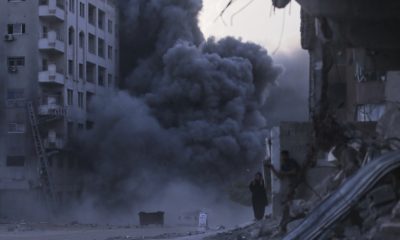 De la fumée s'élève à la suite d'une frappe aérienne israélienne dans la banlieue de Gaza, vue depuis le côté israélien de la frontière avec Gaza, dans le sud d'Israël, lundi. (© KEYSTONE/EPA/ATEF SAFADI)