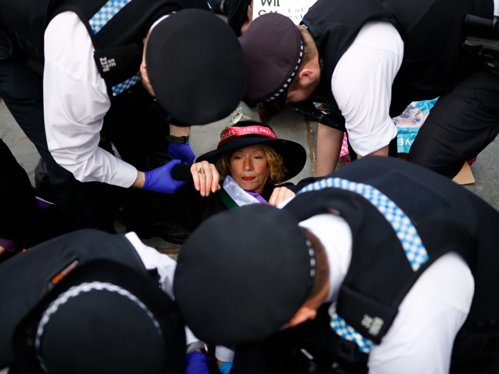 Parmi les personnes arrêtées figurait Robert Del Naja, chanteur membre du groupe britannique Massive Attack, qui était assis avec une pancarte sur laquelle on pouvait lire "I Support Palestine Action" et qui a ensuite été emmené par trois policiers, selon l'agence Press Association (PA).