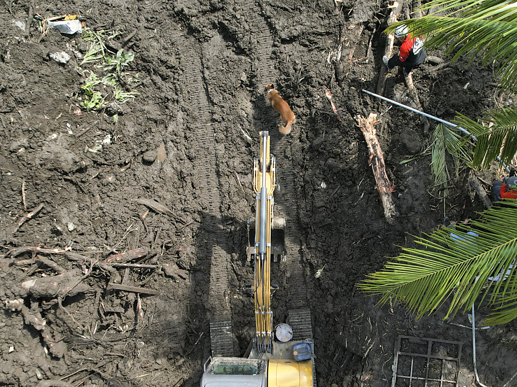 Un chien aide à chercher les disparus après un glissement de terrain dû à la tempête dans la province de Batanga. (© KEYSTONE/AP/Aaron Favila)