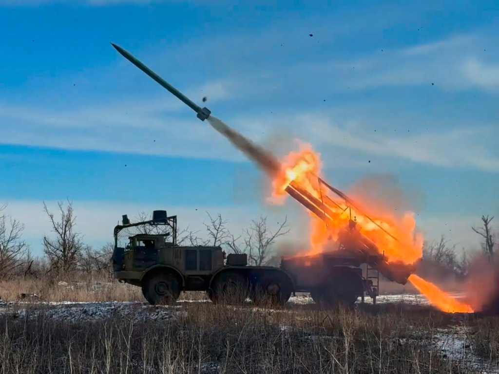 Sur cette image extraite d’une vidéo fournie par le Service de presse du ministère russe de la Défense vendredi 6 mars 2026, un lance-roquettes multiple automoteur russe tire en direction des positions ukrainiennes. (© KEYSTONE/AP)