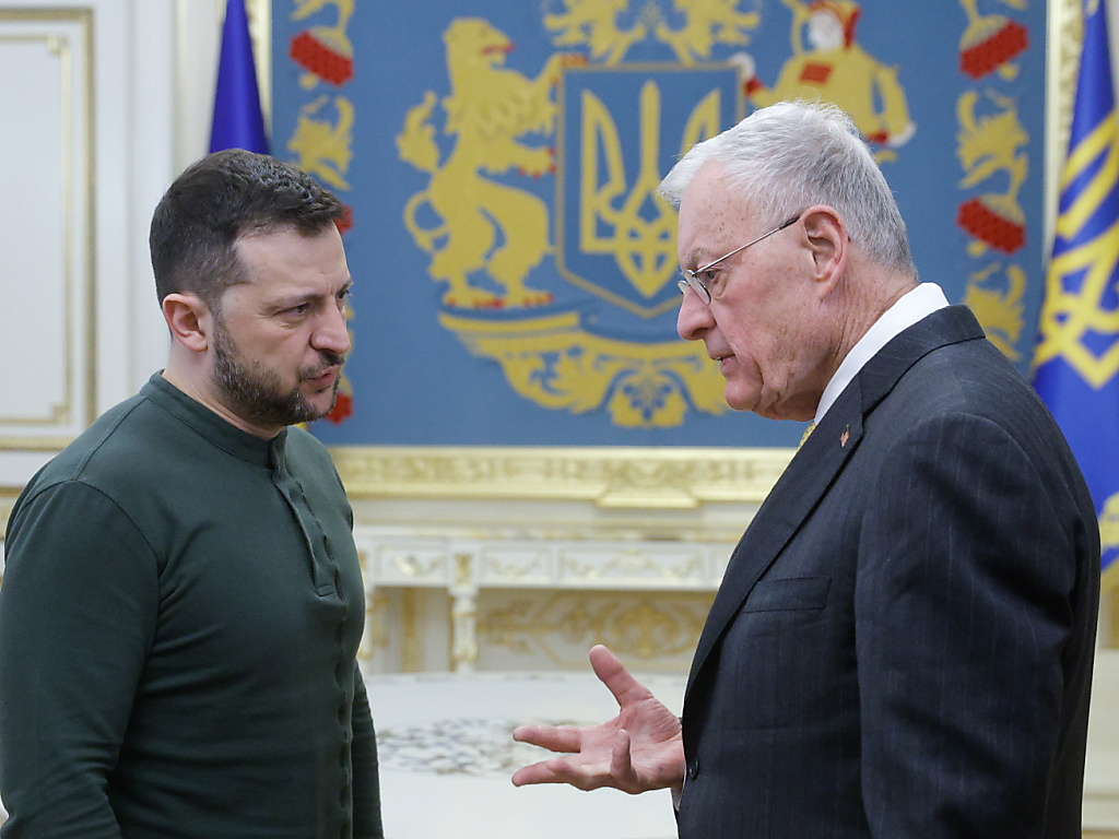 L'émissaire de Donald Trump pour l'Ukraine, Keith Kellogg (à droite), a dit vendredi avoir eu la veille à Kiev une discussion "positive" avec le "courageux" Volodymyr Zelensky. (© KEYSTONE/EPA/SERGEY DOLZHENKO)
