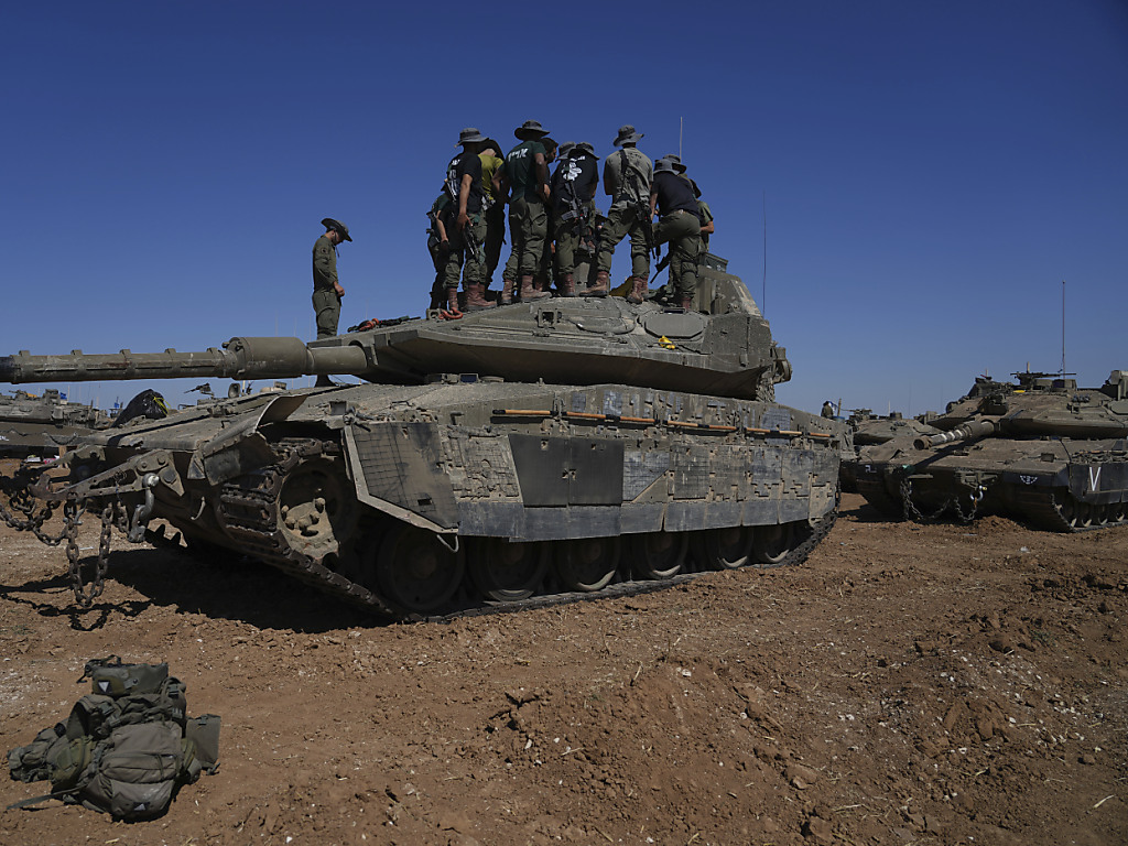 Des soldats israéliens se tiennent sur un véhicule militaire blindé sur une aire de repos près de la frontière entre Israël et Gaza. (© Keystone/AP/Tsafrir Abayov)