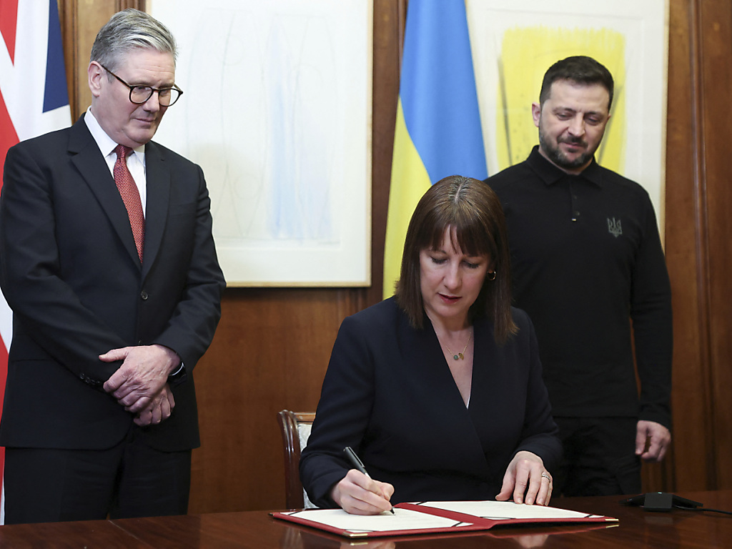 Le Royaume-Uni et l'Ukraine ont signé samedi un accord portant sur un prêt de 2,26 milliards de livres (près de 2,74 milliards d'euros) pour soutenir les capacités de défense de Kiev. Londres l'a présenté comme le signe d'un "soutien indéfectible au peuple ukrainien". (© KEYSTONE/AP/Toby Melville)