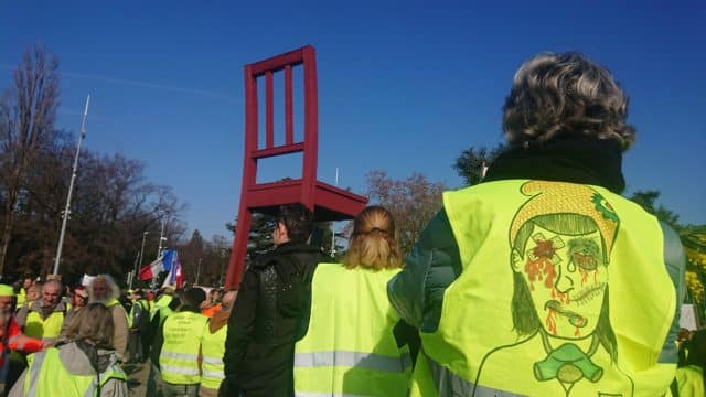 Mercredi, un millier de gilets jaunes s'étaient donné rendez-vous sur la Place des Nations. Leur but: rendre hommage aux victimes dans leurs rangs et dénoncer les violences policières. Les manifestants ont réclamé l'interdiction de l'arme suisse employée par les forces de l'ordre françaises, le LBD 40. Reportage au pied de la célèbre Broken chair: