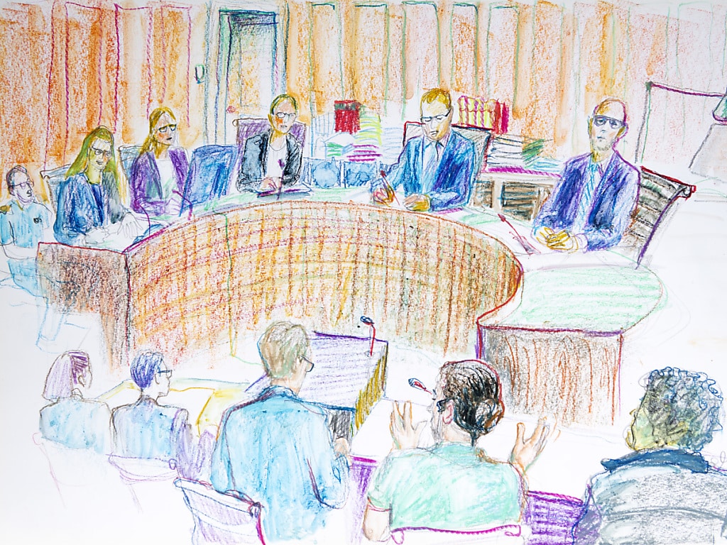 A cause du besoin de place pour les accusés et leurs avocats dans la salle d'audience, le procès est retransmis en vidéo dans deux autres salles du Tribunal. L'un des prévenus est mineur. Il comparait à huis clos.