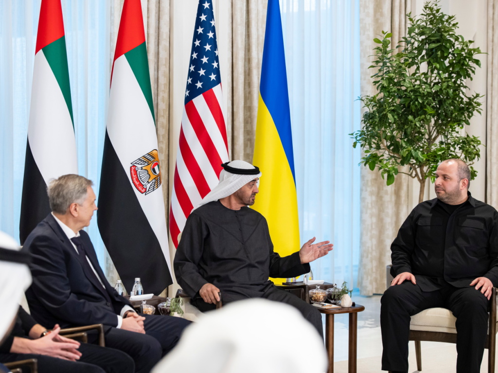 La dernière ronde de discussions entre le russe Igor Kostyukov, 2e à gauche, l'ukrainien Rustem Umerov, à droite, et l'américain Jared Kushner, à gauche, autour du président des Emirats arabes unis, Mohamed bin Zayed Al Nahyan (2e à droite), le 23 janvier à Abou Dhabi. (© KEYSTONE/EPA/UAE Presidential Court /HANDOUT HANDOUT)