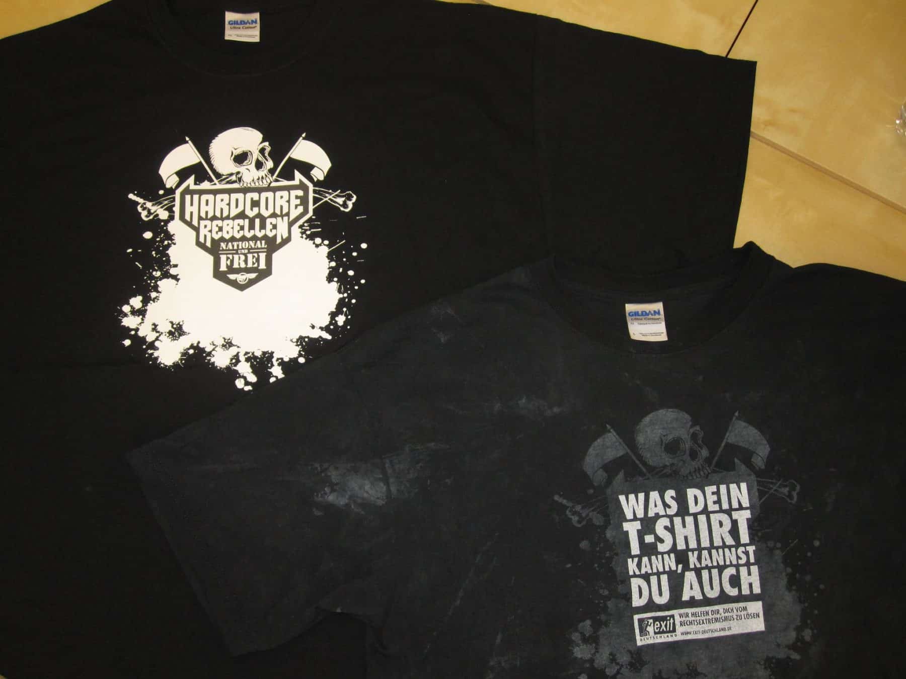 L'association Exit-Deutschland s'était fait connaître en août 2011 en distribuant des tee-shirts "piégés" lors du festival Rock für Deutchland. Au premier lavage, le logo disparaissait pour laisser place à un slogan anti-raciste. (Image Facebook)