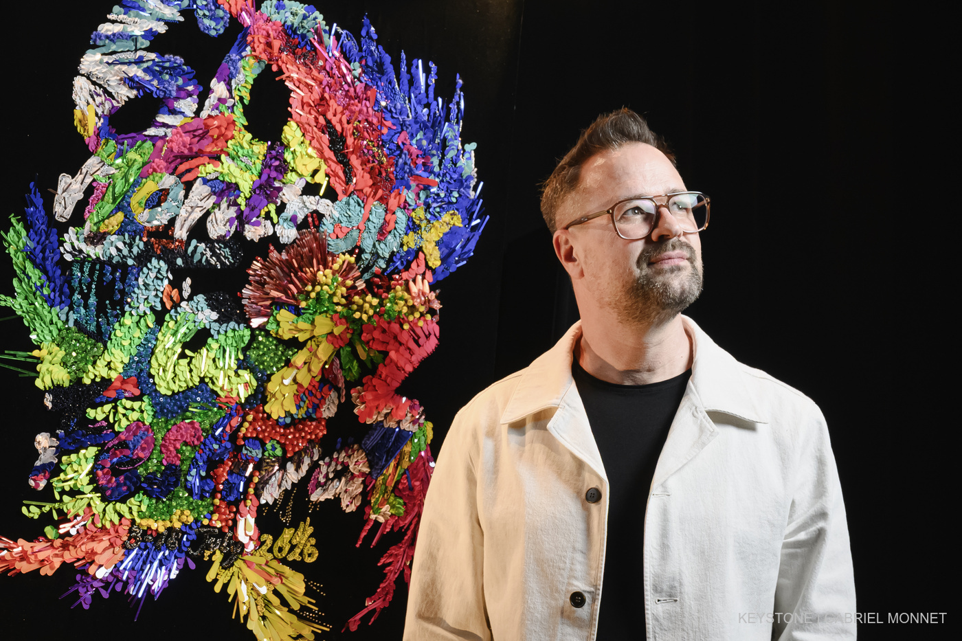 Mathieu Jaton, directeur du Montreux Jazz Festival, regarde vers l'avenir avec l'affiche 2026 du couturier valaisan Kevin Germanier (KEYSTONE/Gabriel Monnet)