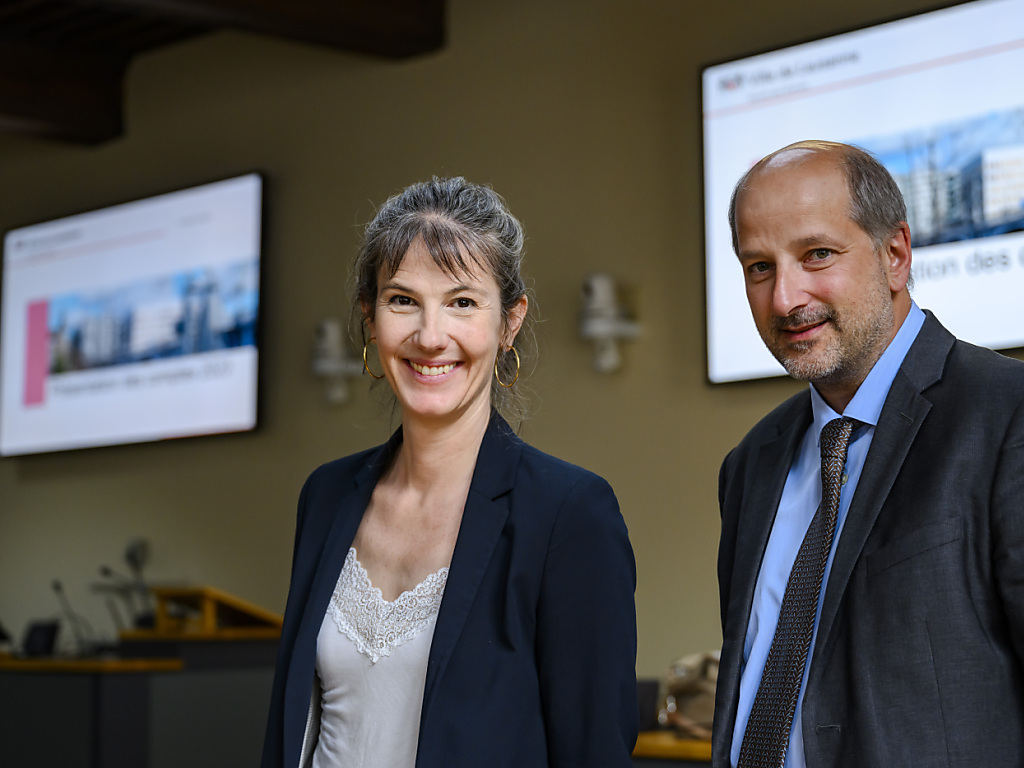 Florence Germond (à gauche), municipale en charge des finances, et Gregoire Junod (à droite), syndic de Lausanne, ont présenté comme à chaque fois ensemble les comptes de la Ville (archives). (© Keystone/JEAN-CHRISTOPHE BOTT)