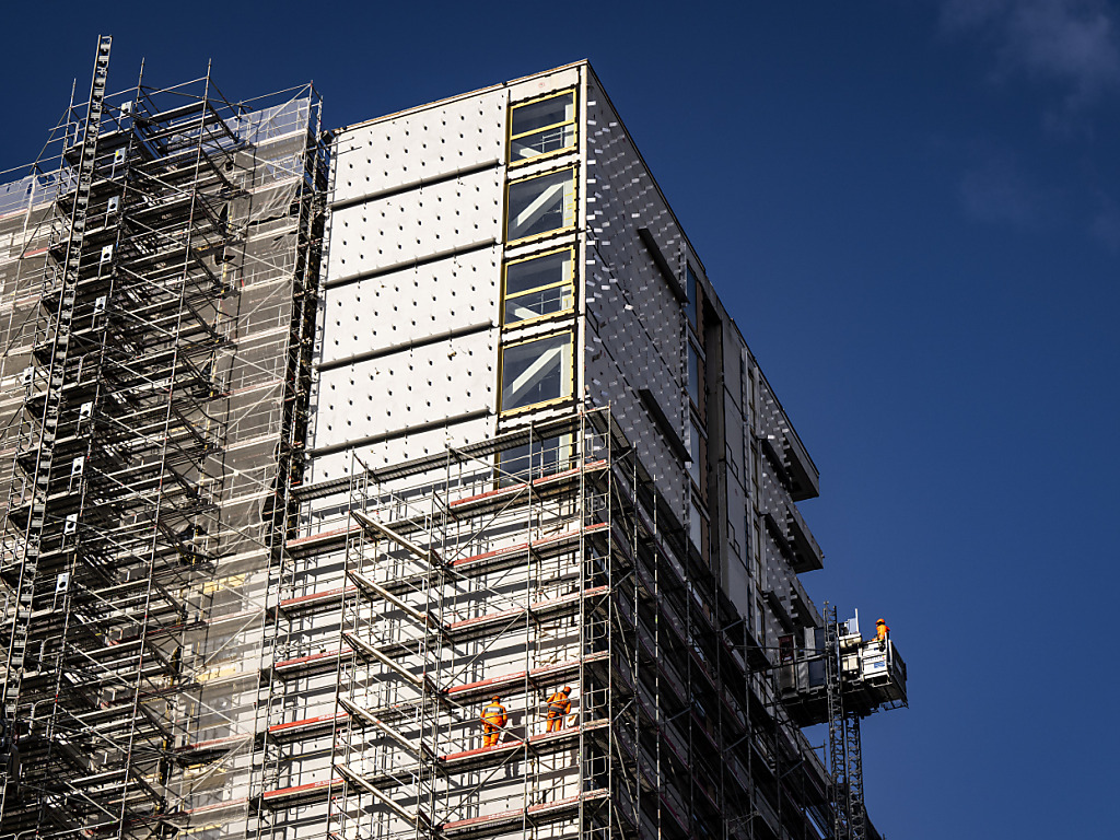 Des ouvriers sont en train de remonter l'échafaudage sur la tour Malley Phare à Prilly. (© KEYSTONE/JEAN-CHRISTOPHE BOTT)