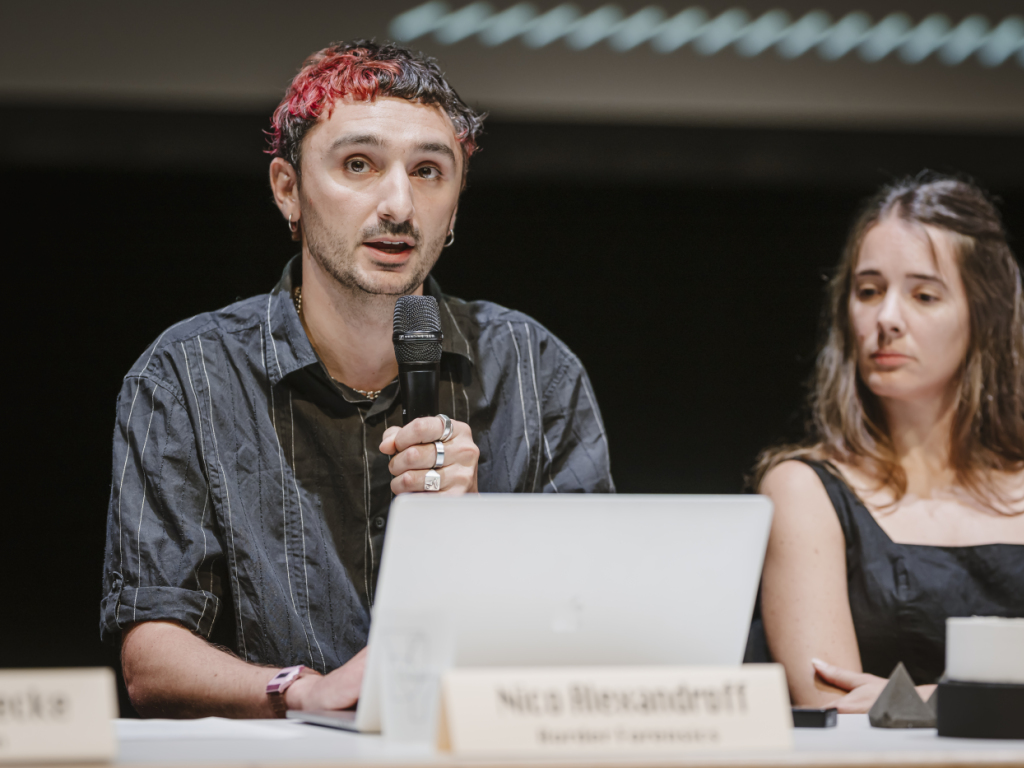 Nico Alexandroff de Border Forensics (à g.) a présenté les détails de l'analyse vidéo à la presse. (© KEYSTONE/GABRIEL MONNET)