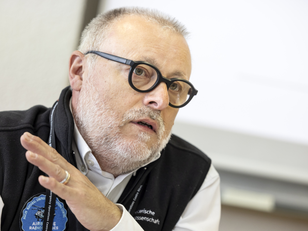 Gerald Scharding, chef de la Centrale nationale d'alarme, a expliqué lundi comment se déroulent les entraînements internationaux de mesures de la radioactivité depuis l'air en Suisse. (© KEYSTONE/MICHAEL BUHOLZER)