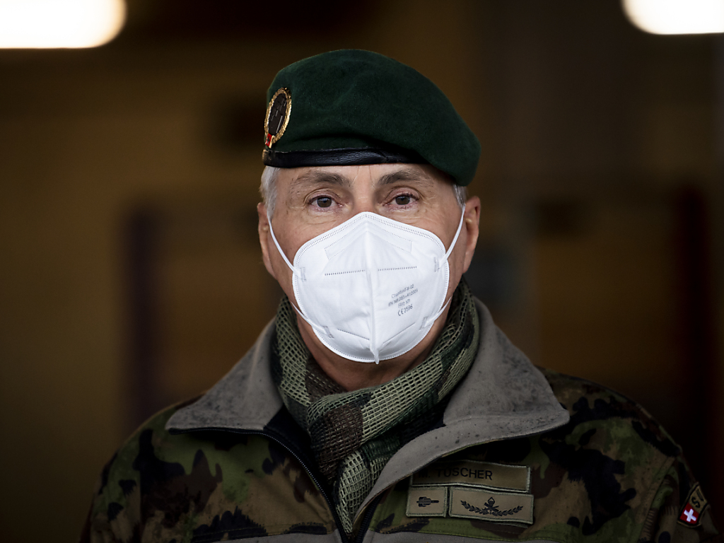 Le masque FFP2 est jugé plus adapté pour l'armée (ici Mathias Tuescher, commandant de la division territoriale 1). (© KEYSTONE/JEAN-CHRISTOPHE BOTT)