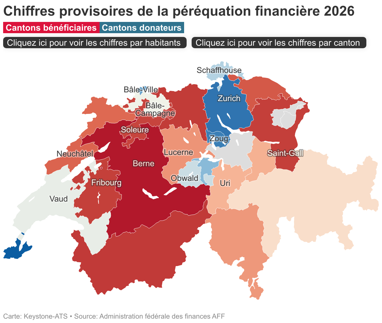 "En chiffres absolus, le canton de Genève est désormais le plus gros contributeur à la péréquation des ressources, avec 543 millions de francs", écrit l'AFF dans un communiqué. La forte augmentation enregistrée par le canton s'explique notamment par les bénéfices exceptionnellement élevés réalisés dans le commerce de l'énergie et des matières premières depuis 2022, ajoute-t-elle.