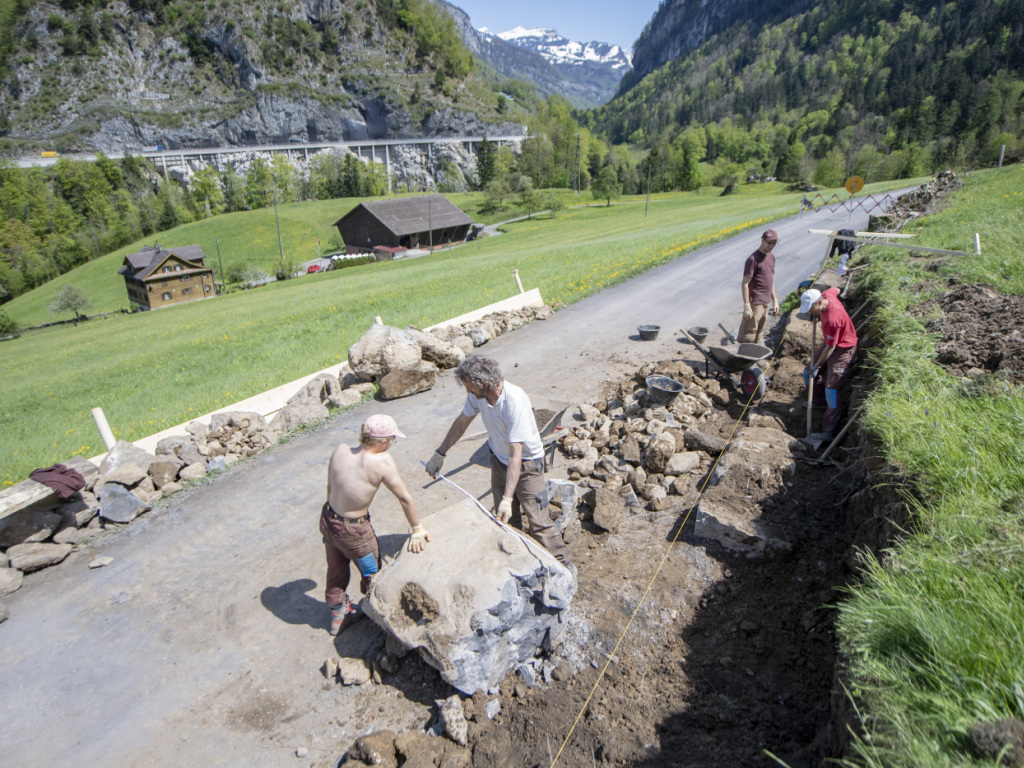 Des civilistes travaillent à la construction d'un mur de pierres sèches le long d'une route dans le Muotathal (SZ) (archives). (© KEYSTONE/URS FLUEELER)