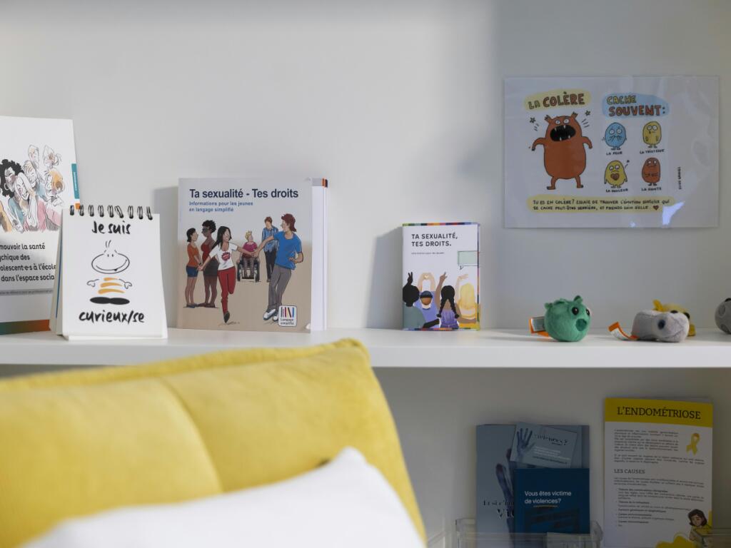 "L'éducation sexuelle de 0 à 18 ans", "Rougir sans gêne: un atelier pour parler des règles", "Avoir mal n'est jamais normal", "Violences domestiques", "Tes droits, tes devoirs". Derrière, huit salles de consultation.