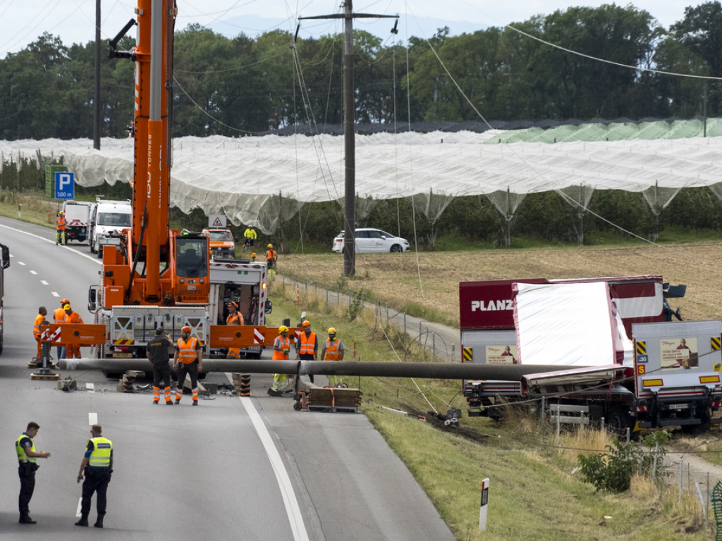 Une grue a été mobilisée sur place pour évacuer le pylône électrique barrant la bande d'urgence et pratiquement les deux voies de l'autoroute dans le sens de Genève. Le camion et sa remorque ont, eux, fini sur une petite route et un champ agricole bordant l'A1.