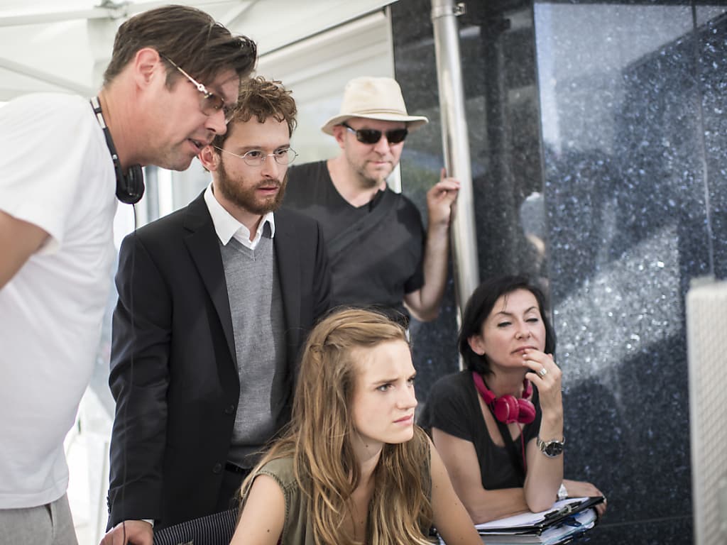 L'équipe du film, avec le réalisateur Michael Steiner à gauche, l'acteur Joel Basman au centre et Noémie Schmidt en bas. (©KEYSTONE/ENNIO LEANZA)