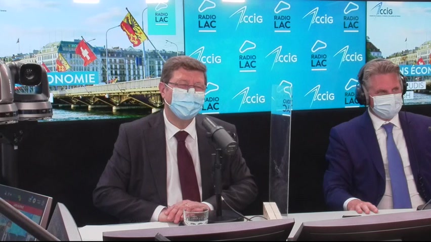 Spéciale Réouverture - Mauro Poggia, Conseiller d'Etat, Vincent Subilia, directeur général de la CCIG, Fernando Martins, patron du restaurant Le Portugais, Helena Rigotti, patronne du Vino Olio caffè, Claude Proz, directeur du Théâtre du Léman, Caroline Boutillon-Duflot, fondatrice de Bilan Santé PME