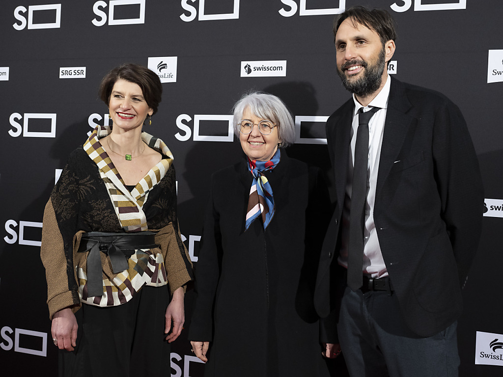La conseillère fédérale Elisabeth Baume -Schneider (centre) pose avec le directeur artistique Niccolo Castelli (droite) et Monica Rosenberg, codirectrice, lors de l'ouverture des 60e Journées de Soleure mercredi soir. (© KEYSTONE/PETER SCHNEIDER)
