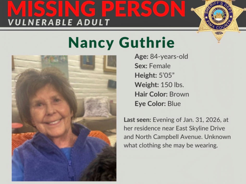 Nancy Guthrie a été vue pour la dernière fois à son domicile près de Tucson, dans l'Arizona, samedi soir. Des gouttes de sang retrouvées à l'entrée de sa maison lui appartiennent, a annoncé jeudi le shérif local, qui privilégie la thèse de l'enlèvement. Il avait auparavant décrit la demeure comme une "scène de crime".