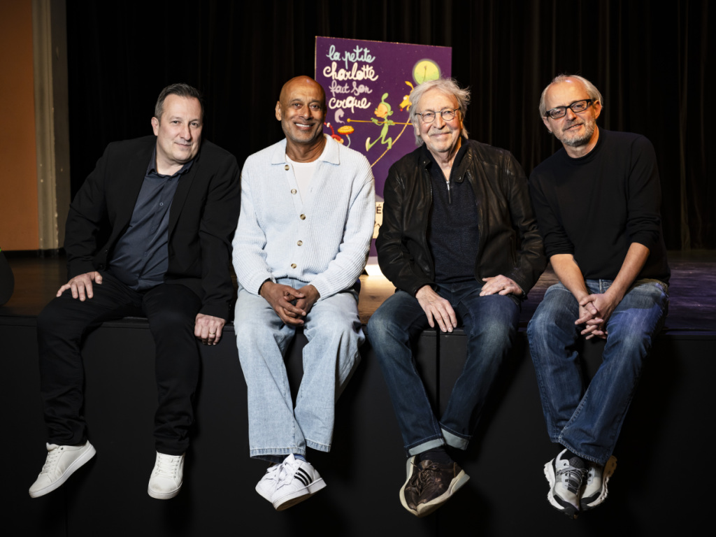 De gauche à droite: Sébastien Soldevila, directeur artistique, Michael Drieberg, directeur de Live Music Production, le chanteur Henri Dès et Francois Pinard de Los Production. Ils ont présenté mercredi le spectacle musical "La Petite Charlotte fait son cirque". (© Keystone/JEAN-CHRISTOPHE BOTT)