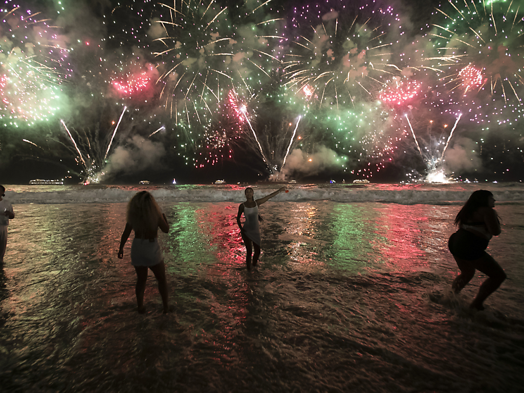 Les gens célèbrent le début de la nouvelle année alors que des feux d'artifice illuminent la plage de Copacabana à Rio de Janeiro au Brésil. C'était le 1er janvier 2024. (© KEYSTONE/AP/BRUNA PRADO)