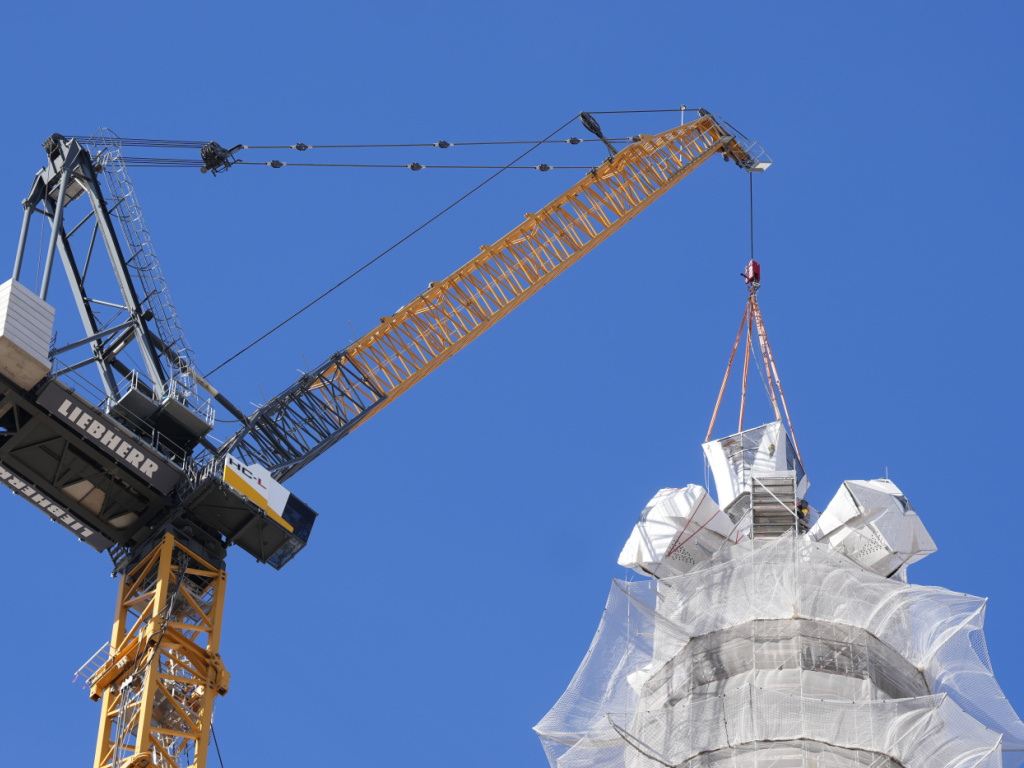 Des centaines de touristes et de curieux se sont rassemblés vendredi matin pour observer les manoeuvres de l'immense grue jaune pour déposer la pièce, haute de 17 mètres et large de 13,5 mètres, au sommet de la tour de Jésus-Christ, la plus haute des 18 planifiées, avec des ouvriers suspendus à des harnais assistant l'opération.