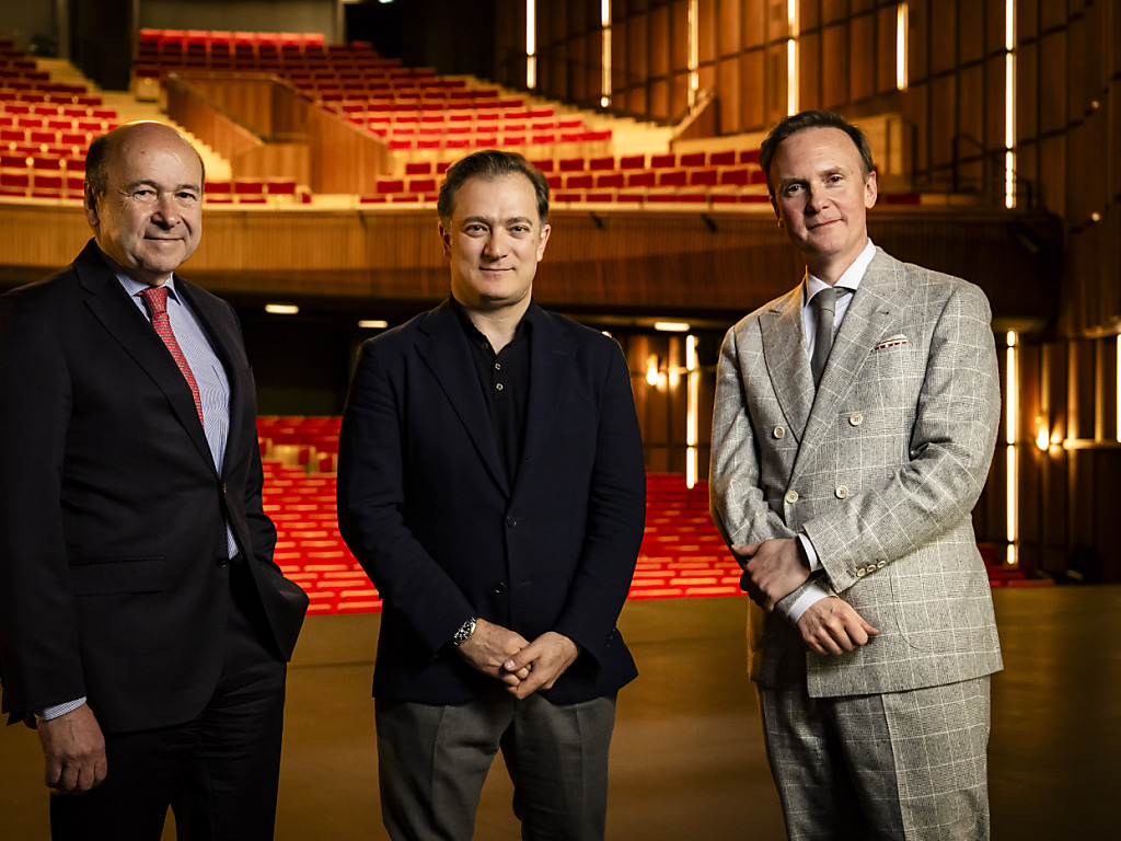 Dominique Meyer, directeur exécutif de l'Orchestre de chambre de Lausanne (OCL), Renaud Capucon, directeur artistique et Edgar Philippin ont présenté une saison 2025-2026 placée sous le signe du renouveau. (© KEYSTONE/JEAN-CHRISTOPHE BOTT)