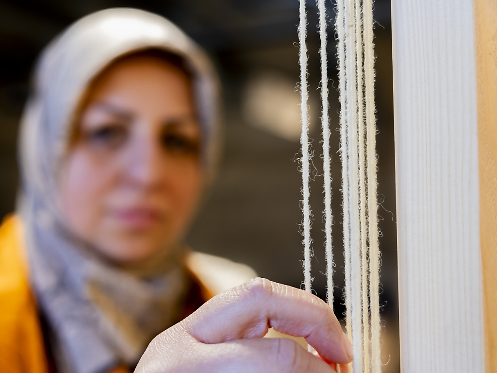 L'artiste iranienne Zahrasadat Hakim va tisser avec le public une oeuvre pour le Musée international de la Croix-Rouge (MICR) à Genève. (© KEYSTONE/SALVATORE DI NOLFI)