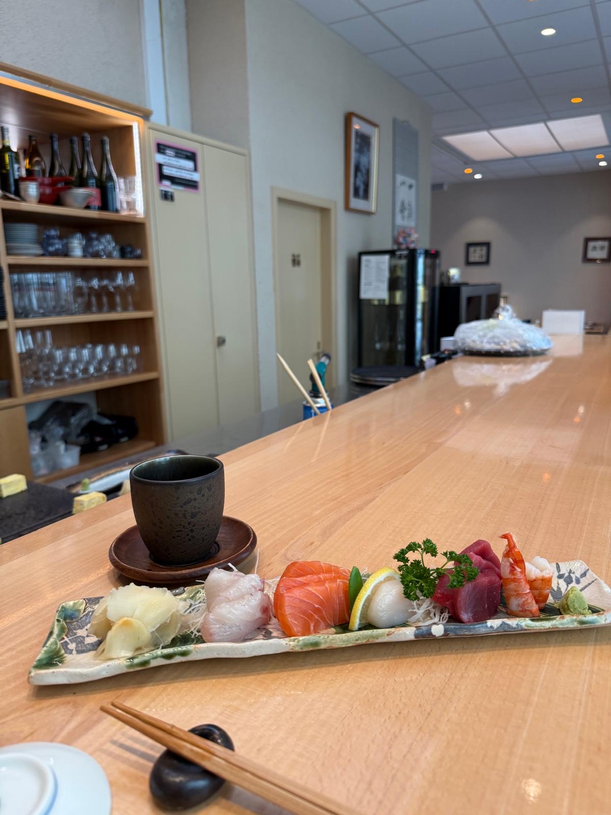 Commençons par prendre place au bar où le maître des lieux le ​chef Hiroshi Machida confectionne chaque sushi derrière le comptoir qui peut accueillir 4 couverts. Une place de choix  vivement recommandée afin de profiter un maximum de l'expérience.L'endroit est stratégique pour admirer l’art de la découpe des sashimis et la composition d’autres créations. Une seule chose, n’oubliez pas de le préciser lors de votre réservation.