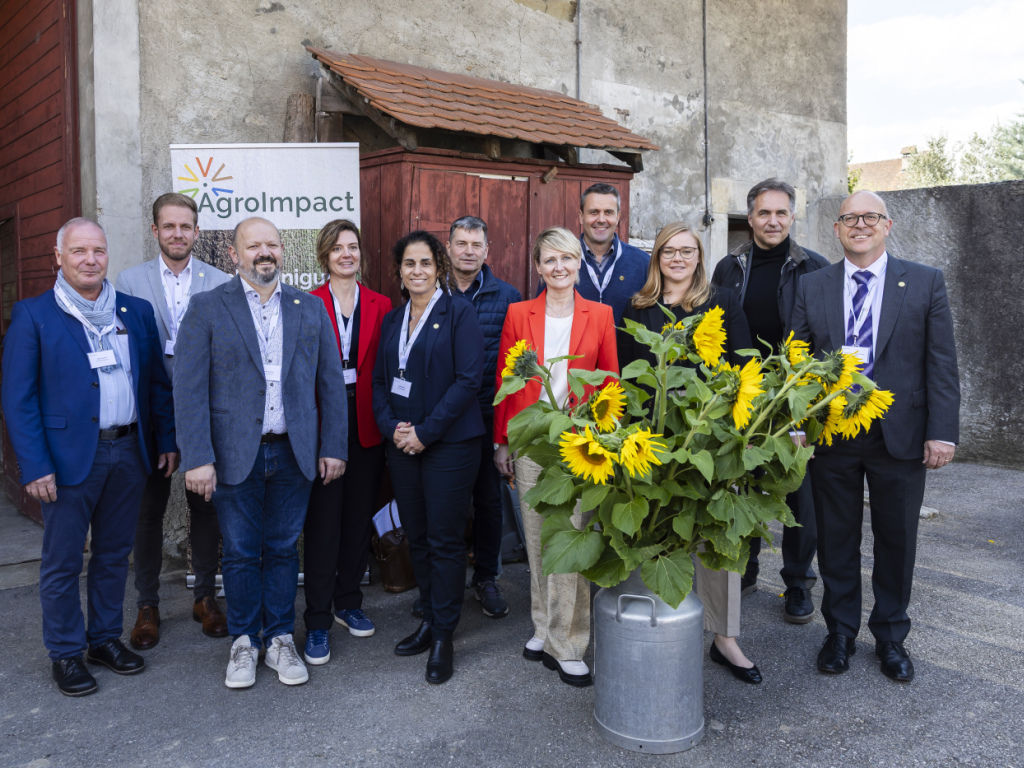 Les parties prenantes d'AgroImpact se sont réunies mardi à Daillens pour présenter la première plateforme de décarbonation des produits agricoles. (© KEYSTONE/CYRIL ZINGARO)