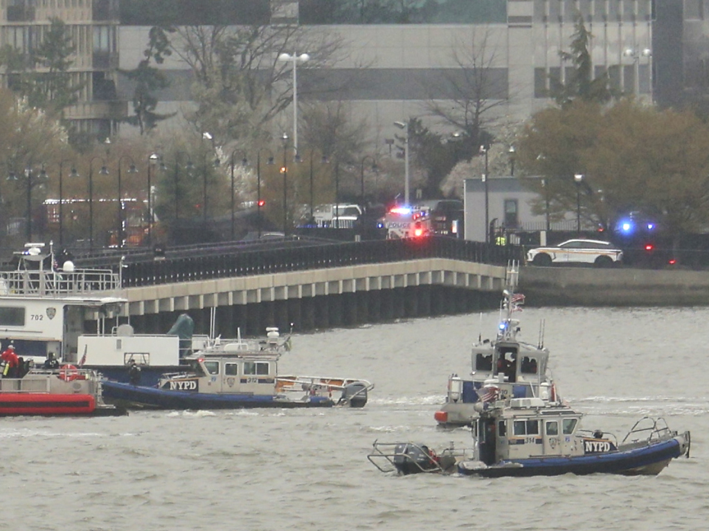 Les images montrent des patins d'atterrissage de l'hélicoptère dépassant de l'eau à côté de la voie rapide West Side de Manhattan, alors que plusieurs bateaux de secours sont regroupés autour de la zone d'impact et des dizaines de pompiers sont sur place. De chaque côté de la rive, à Manhattan ou dans le New Jersey, les zones sont très urbanisées.