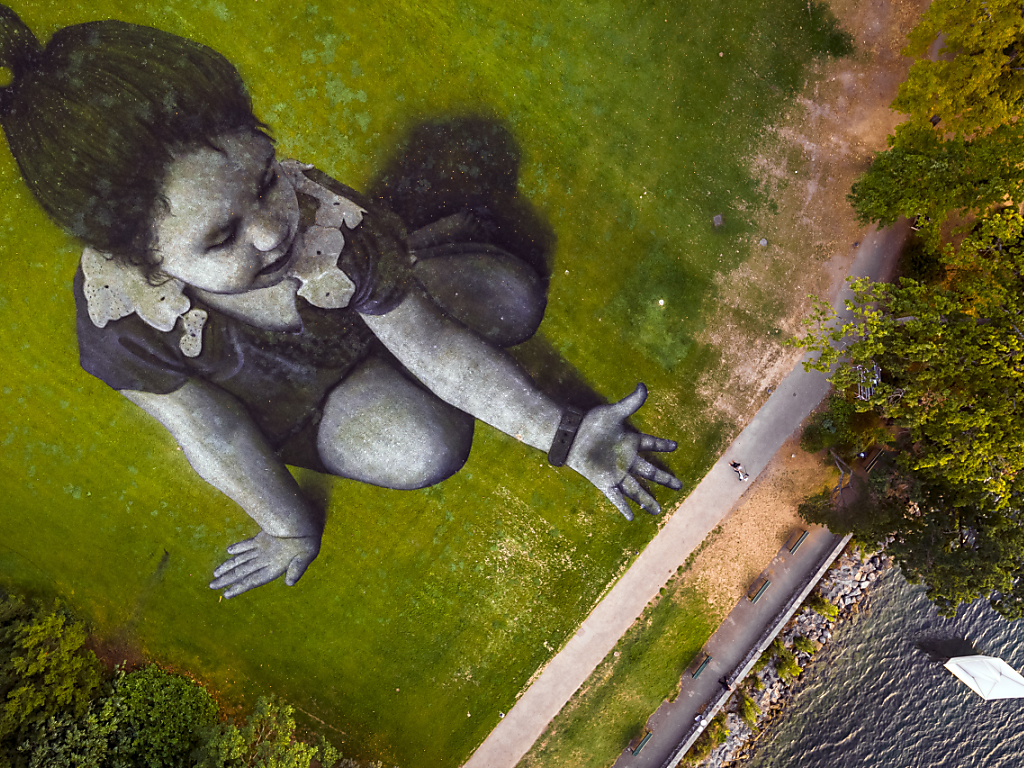 A Genève, l'artiste Saype a réalisé une gigantesque fresque sur la pelouse de la Perle du lac pour les ONG qui viennent au secours des migrants en mer. Cette production a été réalisée avec le soutien de la Ville de Genève et en partenariat avec l'ONG SOS Méditerranée.