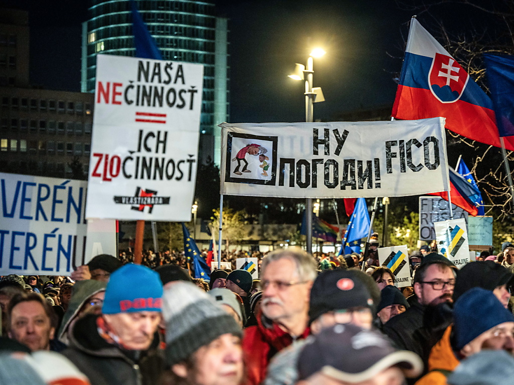"Ici c'est l'Europe!", "Nous avons honte de Fico!", "Nous ne céderons pas la Slovaquie!", scandaient des milliers de manifestants sur la place centrale de Bratislava. (© KEYSTONE/EPA/JAKUB GAVLAK)