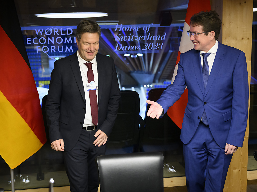 Le ministre de l'énergie Albert Rösti (à droite) avait rencontré son homologue allemand Robert Habeck à Davos en janvier (archives). (© KEYSTONE/LAURENT GILLIERON)