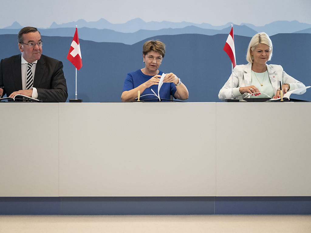 La conseillère fédérale Viola Amherd (centre) avait signé avec ses homologues allemand, Boris Pistorius (gauche) et autrichien Klaudia Tanner (droite) une déclaration d'intention sur le bouclier antimissile européen en juillet 2023 (archives). (© KEYSTONE/ALESSANDRO DELLA VALLE)