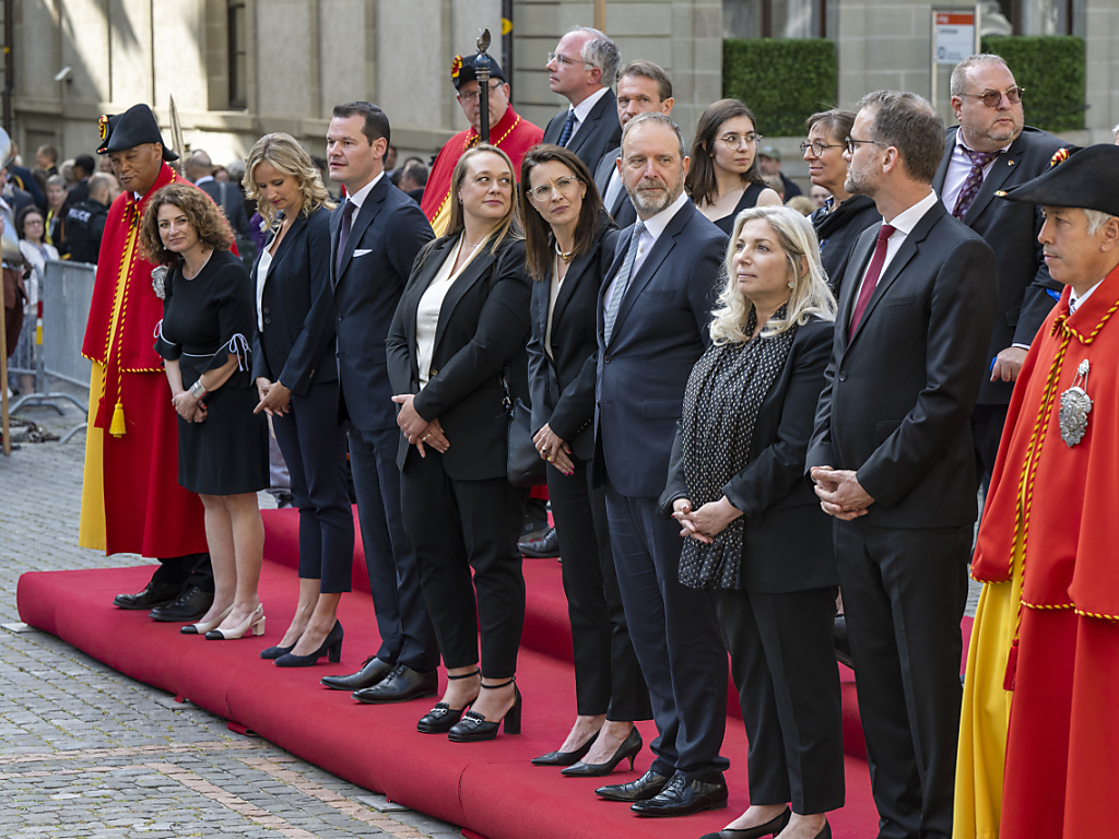 Le Conseil d'Etat genevois, ici lors de sa prestation de serment le 31 mai dernier, devra présenter un nouveau projet de budget au Grand Conseil, si sa première mouture ne trouve pas de majorité (archives), (© KEYSTONE/MARTIAL TREZZINI)